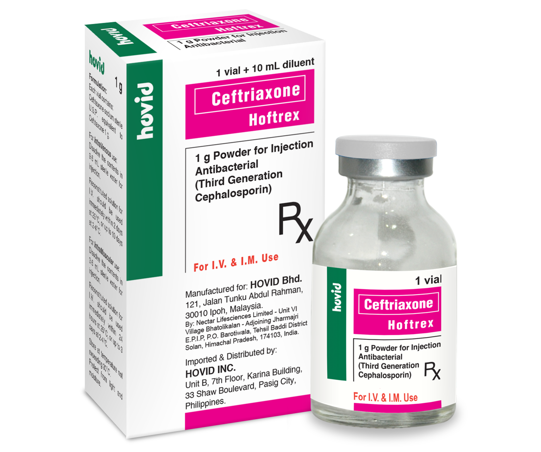 Hoftrex 1g (Ceftriaxone Na) is a Cephalosporin anti-bacterial used in treating infection caused by susceptible organisms such as sinus and throat infections,respiratory tract infections,bacterial urinary tract infections,meningitis,otitis media,female pelvic infections,skin & soft tissue infections,bone & joint infections and intra-abdominal infections. It can be administered through IM or IV.